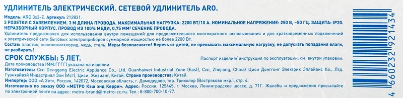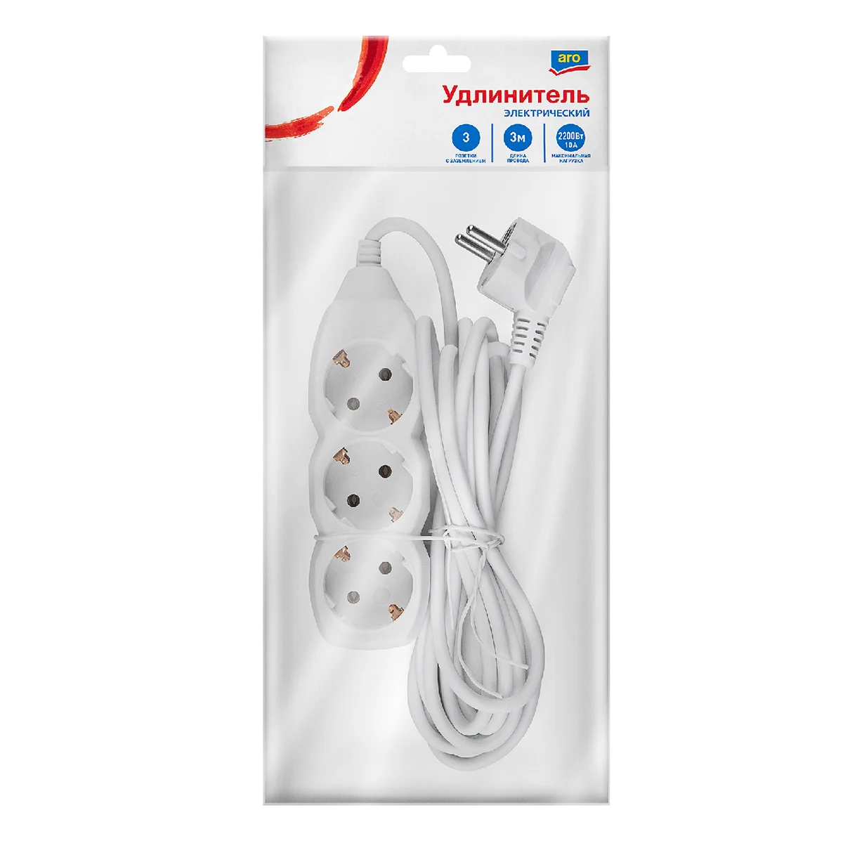 Aro Удлинитель сетевой-Z, 3 x 3 м – незаменимый предмет дома, в поездке и на даче. Он позволяет подключать к сети и использовать сразу три устройства. При этом суммарная мощность электроприборов не должна превышать 2200 Вт. Длина провода удлинителя составляет 3 метра. В нем предусмотрена функция заземления. Расположение гнезд классическое – в один ряд. Удлинитель выполнен в универсальном и лаконичном белом цвете, поэтому не будет привлекать к себе лишнего внимания и останется практически незаметным в интерьере помещения.