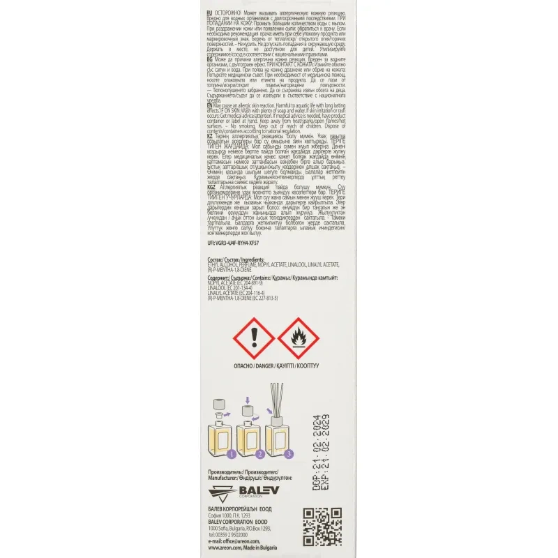 При несоблюдении правил безопасности, указанных на упаковке, производитель не несёт ответственность за ущерб. Состав: парфюмерная композиция, стекло, дерево. Без содержания спирта.