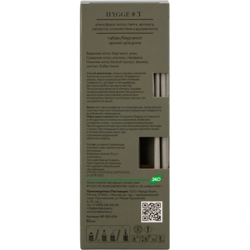 Ароматический диффузор Arida Home Hygge № 3 Табак и Бергамот, 50 мл