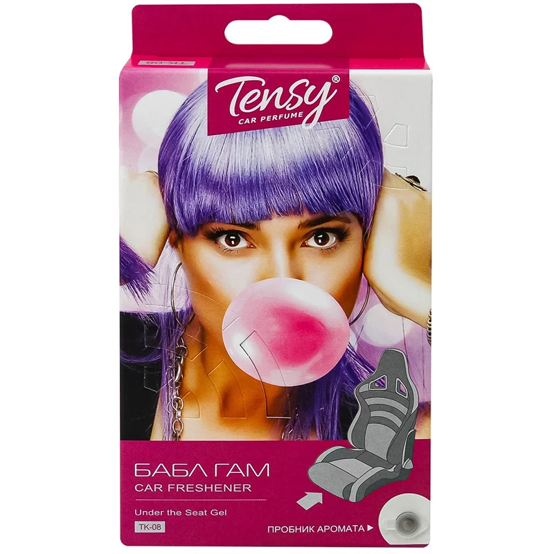 Ароматизатор Tensy Бабл гам TK08 представлен отечественным производителем ароматических средств для автомобилей ЕВА групп и создан с использованием высококачественных отдушек, специально разработанных для этой серии европейскими парфюмерами. Он выполнен из инновационного экологичного гелевого абсорбента, который сохраняет устойчивую насыщенную отдачу запаха на протяжении длительного времени. Гель помещен в компактный пластиковый контейнер с вентиляционными отверстиями и при контакте с воздухом равномерно и быстро распределяет ароматическую композицию по внутреннему пространству автомобиля. Этот ароматизатор предназначен для скрытого размещения под пассажирским сиденьем. На его картонной упаковке находится пробник запаха. Российская фирма ЕВА групп с 2006 года представляет на рынке освежители воздуха и ароматизаторы под торговой маркой Tensy. Компания имеет собственную производственную базу в Москве и напрямую сотрудничает с ведущими парфюмерными домами Европы. Ее постоянно пополняемый ассортимент состоит из эксклюзивных разработок и включает все виды ароматической продукции.