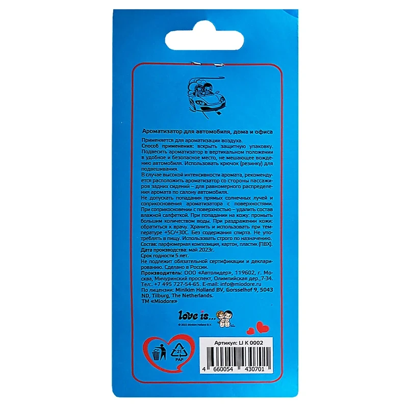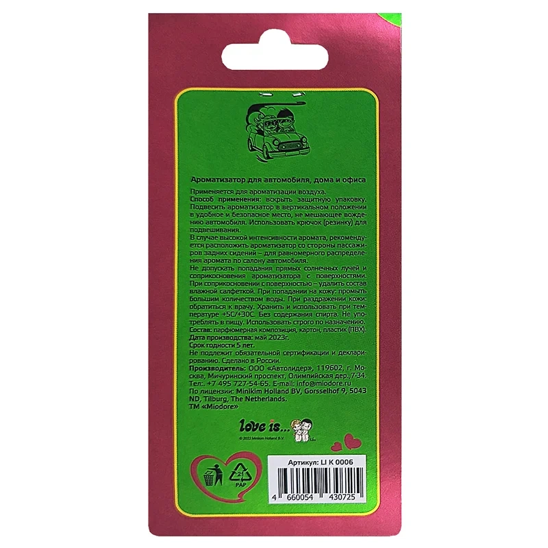 Предназначен для освежения и ароматизации воздуха в салоне транспортного средства. Изготовлен из ароматизированного эластичного полимера. Стойкий аромат. Оригинальный дизайн. Яблоко-лимон и Шоколад-дыня - отсылка к коллекции вкладышей из любимой с детства жевательной резинки. Сочетание ароматов не оставляет равнодушным - ведь при создании этой линейки используются высококачественные французские парфюмированные масла. Ароматизатор воздуха Love Is... поможет ощутить взрыв эмоций и окунуться в ностальгию.
