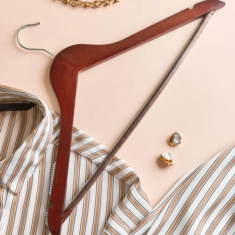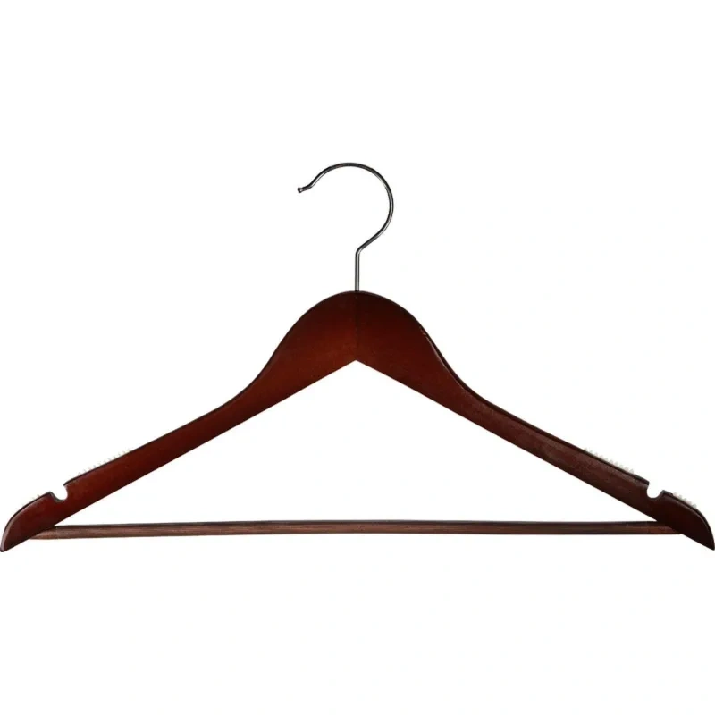 Вешалка-плечики размера 48-50 Jas Attache F6612NJ изготовлена из натуральной древесины (схима) с антискользящими вставками, выемками и перекладиной для брюк, юбок. Поставляется по 3 штуки в упаковке. Толщина самой вешалки 12 мм.