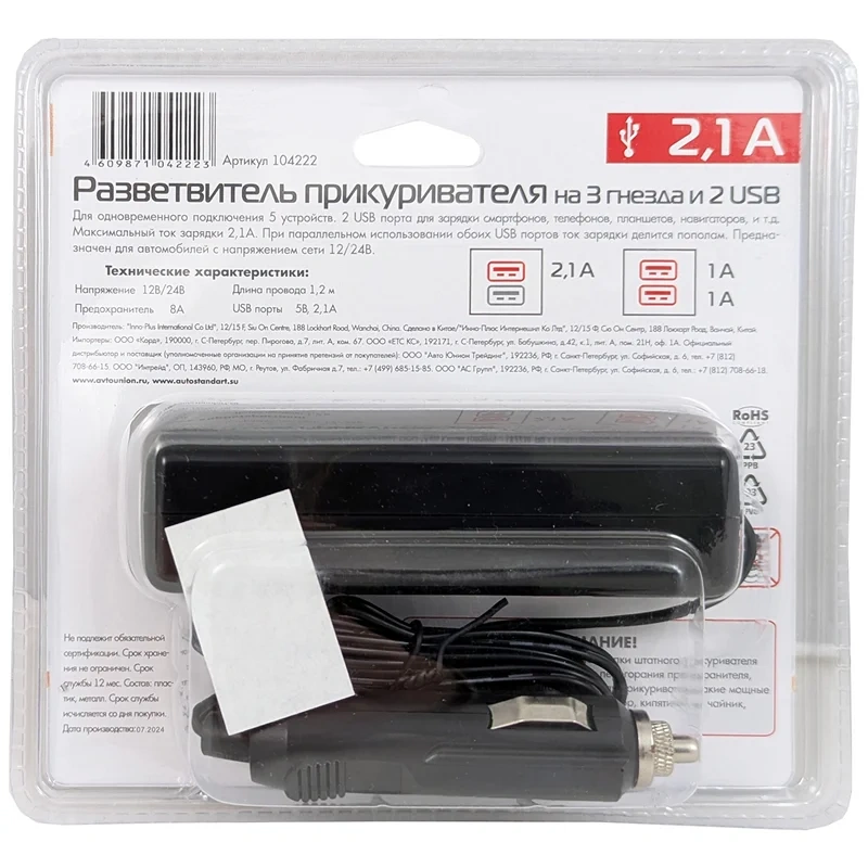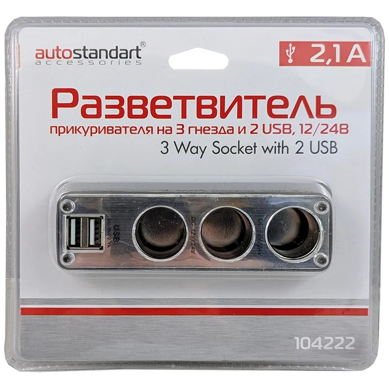 Разветвитель прикуривателя Autostandart 3 гнезда + 2Usb