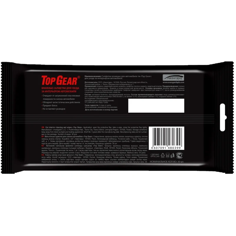 Салфетки влажные для автомобиля Top Gear для салона, 30шт/уп