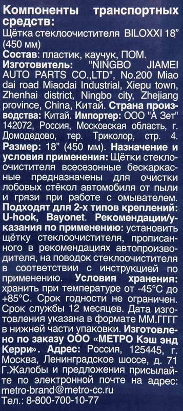 Щетка стеклоочистителя Biloxxi PFW18, 45см