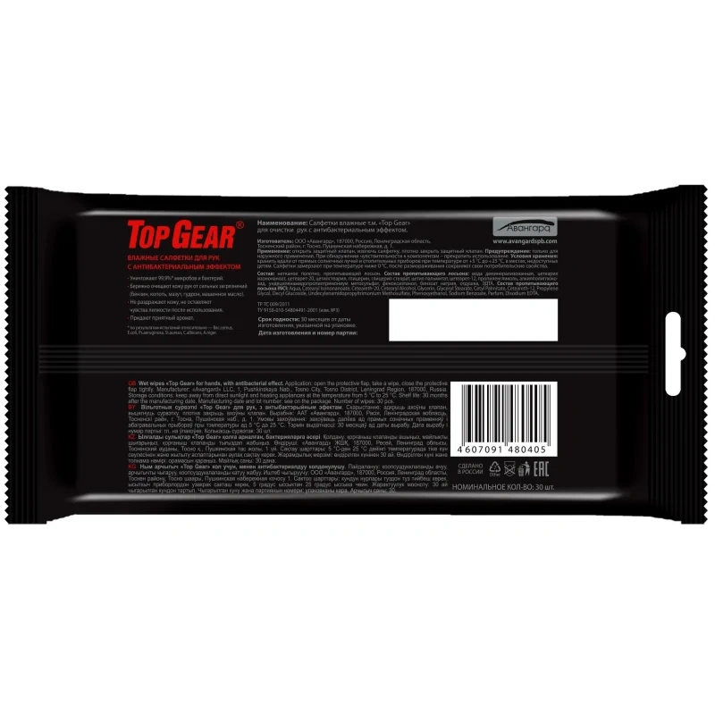 Салфетки влажные для автомобиля Top Gear для рук, 30шт/уп