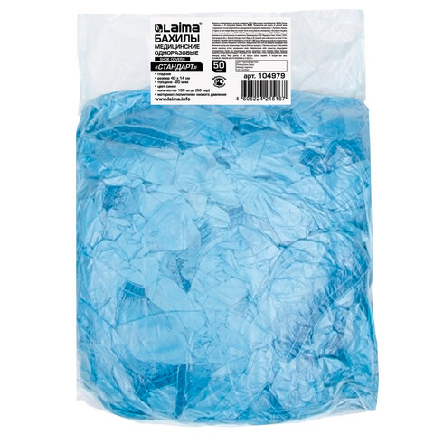 Бахилы 100 штук (50 пар) в упаковке, СТАНДАРТ, размер 39х14см, 20 мкм, 3 г, ПНД, ЛАЙМА