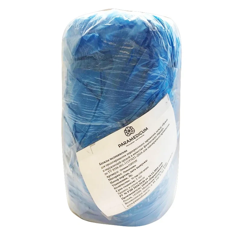 Бахилы одноразовые Парамедикум полиэтиленовые защитные чехлы, надеваемые поверху на обувь. Изготовлены из полиэтилена толщиной 26 мкм, голубого цвета; поверхность текстурированная для антискольжения. Вес пары - 3.5 г, размер изделия - 40x14 см. Минимальная упаковка - 50 пар (100 штук), в коробке - 3000 пар. Применяются преимущественно в гигиенических целях для сохранения чистоты помещений от уличной грязи в медицинских и лечебных учреждениях, особо чистых производствах, музеях, салонах и других объектах. После использования бахилы подлежат утилизации. Производство - Россия. Допустимое отклонение от заявленных параметров - + 10 %.