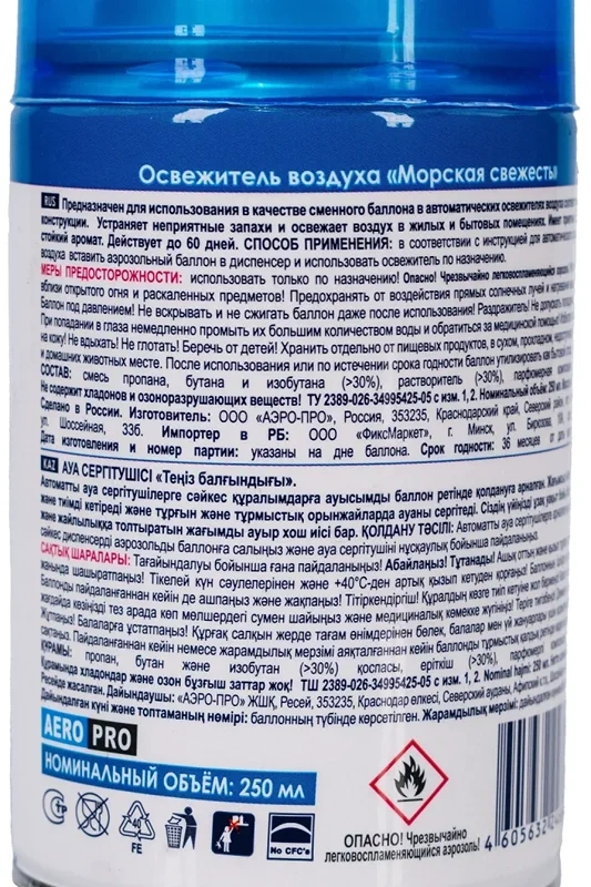 Смесь пропана, бутана и изобутана (>30%), растворитель (>30%), парфюмерная композиция (<5%), лимонен.