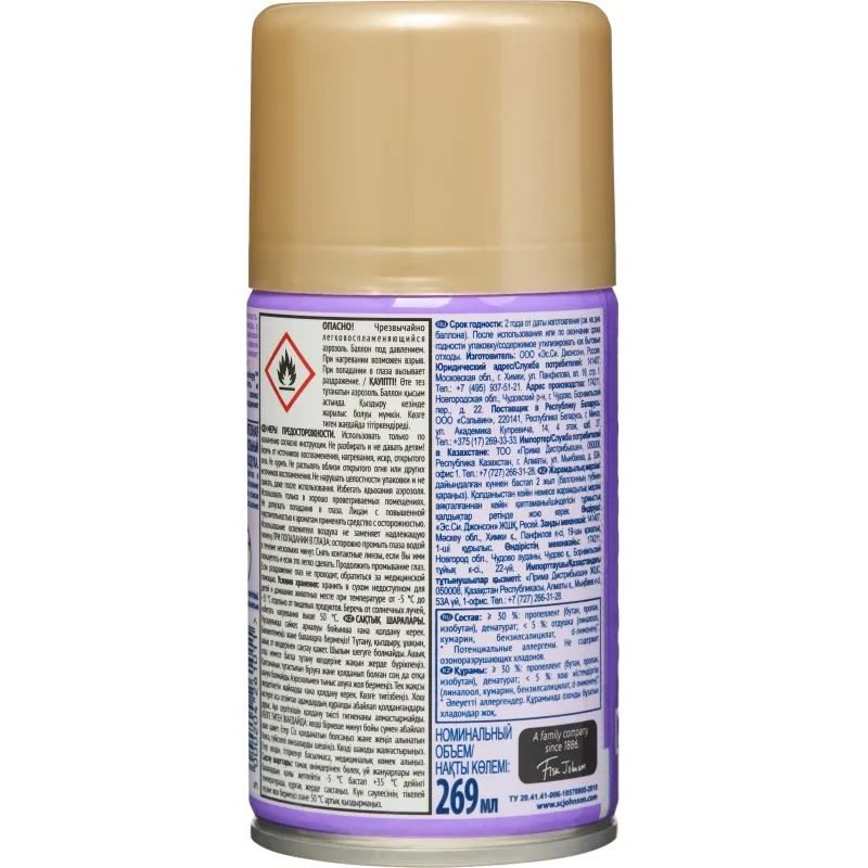 Баллон сменный для автоматического освежителя Glade Лаванда иалоэ 269 мл Назначение: погрузись вполную безмятежность. Созданный сзаботой оприроде, сумиротворяющими нотами прованской лаванды, алоэ илепестков нежной фиалки, этот аромат поможет расслабиться иотдохнуть. Универсальный Баллон сменный, подходит клюбым автоматическим освежителям воздуха. 'True Scent Technology' гарантирует безопасность иэкспертную формулу своих аэрозолей для создания ощущения чистоты. Парфюмерные композиции сэфирными маслами. Аромат 24/7, до2400распылений. Способ применения: замена баллона- держите устройство внаправлении 'отсебя'. Откройте, переведите переключатель вположение 'off' иизвлеките пустой баллон. Вставьте Баллон сменный носиком наружу. Включите устройство, установив таймер. Первое распыление произойдет через несколько секунд. Меры предосторожности: использовать только поназначению согласно инструкции. Неразбирать инедавать детям! Беречь отисточников воспламенения, нагревания, искр, открытого огня. Некурить. Нераспылять вблизи открытого огня идругих источников воспламенения. Ненарушать целостности упаковки инесжигать, даже после использования. Избегать вдыхания аэрозоля. Использовать только вхорошо проветриваемых помещениях. Недопускать попадания вглаза. Лицам сповышенной чувствительностью кароматам применять средство состорожностью. Использование освежителя воздуха незаменяет надлежащую гигиену. При попадании вглаза: осторожно промыть глаза водой втечение нескольких минут. Снять контактные линзы, еслиВы ими пользуетесь иесли это легко сделать. Продолжить промывание глаз. Если раздражение глаз непроходит, обратиться замедицинской помощью. Состав: > 30% пропеллент (бутан, пропан, изобутан) денатурат; < 5%: отдушка (линалоол, бензилсалицилат, d-лимонен, гидроксицитронеллаль). Потенциальные аллергены. Несодержит озоноразрушающих хладонов. Условия хранения: хранить всухом, недоступном для детей идомашних животных месте при температуре от 5 до+35С, отдельно отпищевых продуктов. Беречь отсолнечных лучей, избегать нагревания выше 50С. Срок годности: 24месяца сдаты изготовления (дату изготовлениясм.наупаковке).