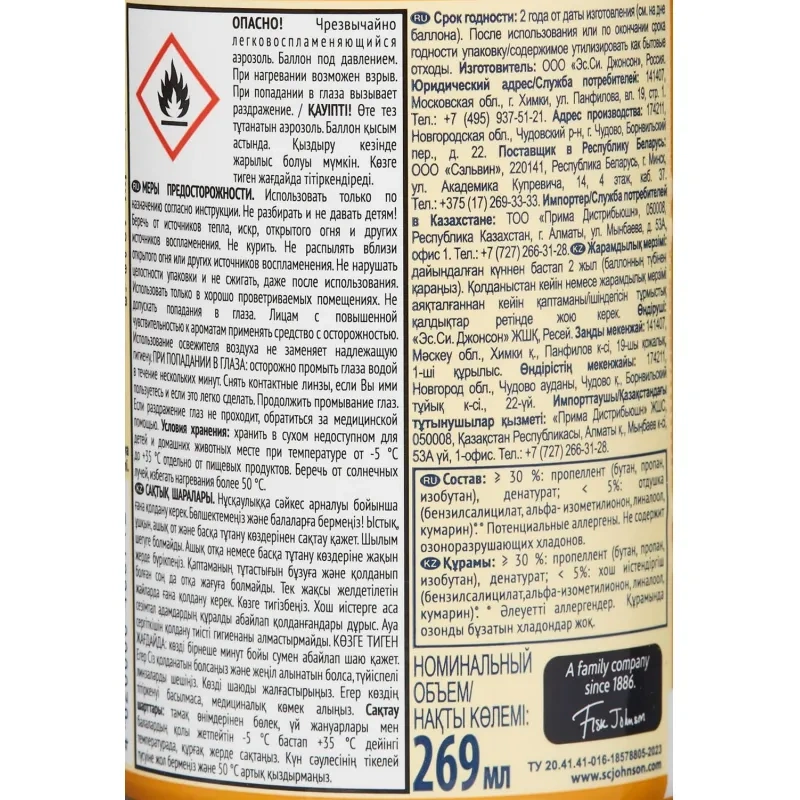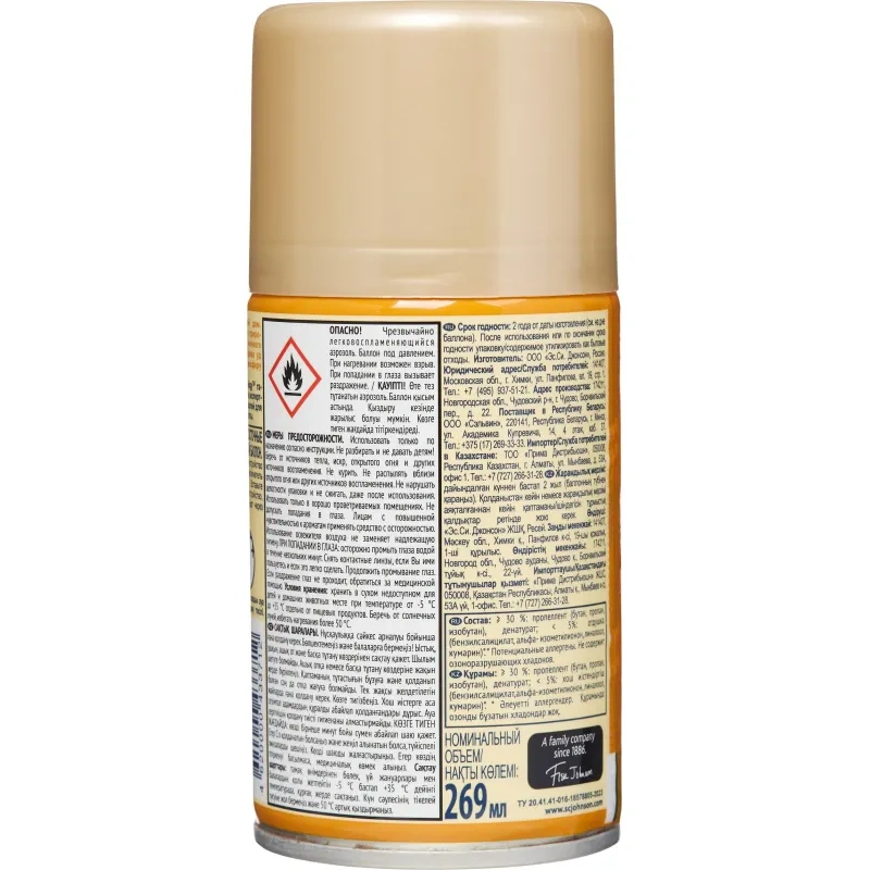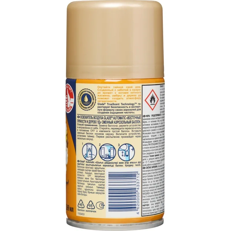 Баллон сменный для автоматического освежителя Glade Восточные пряности 269 мл Назначение: окутай тайной свой дом. Созданный сзаботой оприроде, снотами ночного жасмина, амбры идеревауд, этот аромат поможет создать атмосферу загадочности. Универсальный Баллон сменный, подходит клюбым автоматическим освежителям воздуха. 'True Scent Technology' гарантирует безопасность иэкспертную формулу своих аэрозолей для создания ощущения чистоты. Парфюмерные композиции сэфирными маслами. Аромат 24/7, до2400распылений. Способ применения: замена баллона- держите устройство внаправлении 'отсебя'. Откройте, переведите переключатель вположение 'off' иизвлеките пустой баллон. Вставьте Баллон сменный носиком наружу. Включите устройство, установив таймер. Первое распыление произойдёт через несколько секунд. Меры предосторожности: использовать только поназначению согласно инструкции. Неразбирать инедавать детям! Беречь отисточников воспламенения, нагревания, искр, открытого огня. Некурить. Нераспылять вблизи открытого огня идругих источников воспламенения. Ненарушать целостности упаковки инесжигать, даже после использования. Избегать вдыхания аэрозоля. Использовать только вхорошо проветриваемых помещениях. Недопускать попадания вглаза. Лицам сповышенной чувствительностью кароматам применять средство состорожностью. Использование освежителя воздуха незаменяет надлежащую гигиену. При попадании вглаза: осторожно промыть глаза водой втечение нескольких минут. Снять контактные линзы, еслиВы ими пользуетесь иесли это легко сделать. Продолжить промывание глаз. Если раздражение глаз непроходит, обратиться замедицинской помощью. Состав: > 30% пропеллент (бутан, пропан, изобутан) денатурат; < 5%: отдушка (линалоол, бензилсалицилат, d-лимонен, гидроксицитронеллаль). Потенциальные аллергены. Несодержит озоноразрушающих хладонов. Условия хранения: хранить всухом, недоступном для детей идомашних животных месте при температуре от 5 до+35С, отдельно отпищевых продуктов. Беречь отсолнечных лучей, избегать нагревания выше 50С. Срок годности: 24месяца сдаты изготовления (дату изготовлениясм.наупаковке).