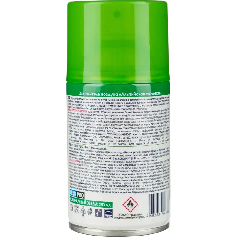 Назначение: предназначен для использования в качестве сменного баллона в автоматических освежителях воздуха соответствующей конструкции. Баллон можно использовать, как отдельно от диспенсера, так и в качестве сменного блока.Способ применения: перед тем, как вставить аэрозоль, проверьте, что диспенсер выключен. Не направляйте в лицо при включении или при установке интервала распыления.