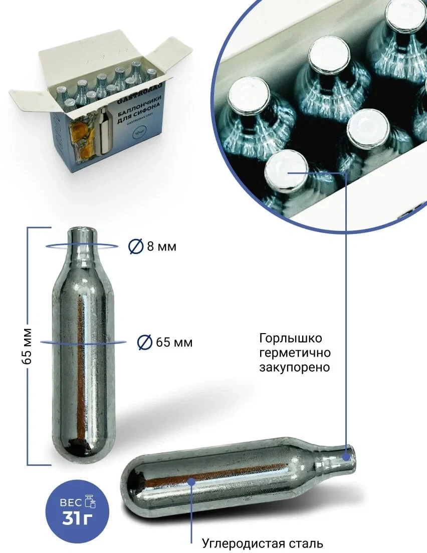 Баллончики Gastrorag для сифона CO2, 10 штук содержат 8 граммов чистого природного CO2. CO2 — это углекислый газ без запаха и цвета, негорючий газ с легким кислым вкусом, он не содержит минералов, солей или других твердых ингредиентов. СО2 используется во всем мире для приготовления пищи, глубокой заморозки и как заряд для сифонов (газированных напитков). С помощью баллончиков CO2 и сифонов вы всегда сможете приготовить любой газированный напиток.