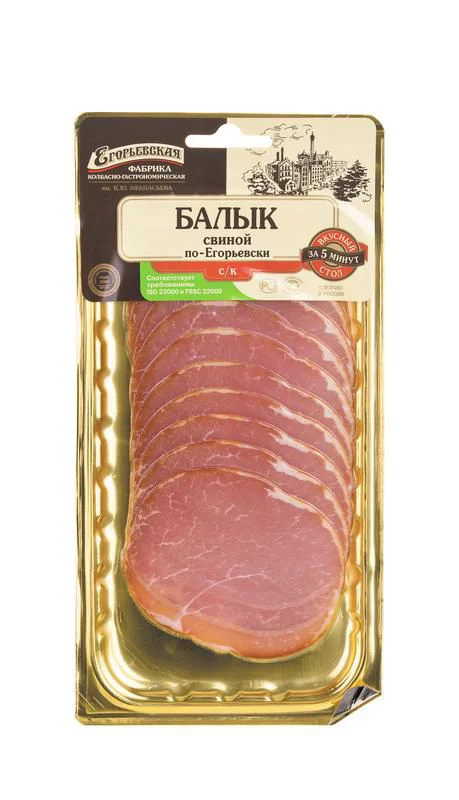 Балык Свиной по-Егорьевски производится только из натурального мяса. Компания сотрудничает с фермерскими хозяйствами, которые выращивают только лучше породы животных. Тщательный отбор сырья помогает создать качественный и вкусный товар, который после тщательной обработки попадает на прилавки магазинов. Продукт не содержит ГМО. Балык получается очень вкусным, вяление мяса происходит в лучших традициях. Для получения аппетитной нарезки берется самая мягкая часть туши.