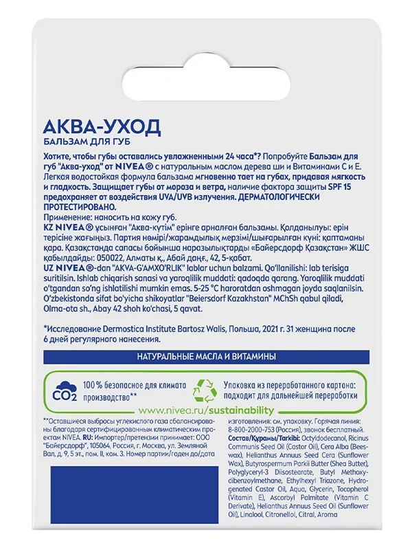 Бальзам для губ Nivea Аква-ухода с алоэ вера, маслами авокадо и дерева ши, 4.8г