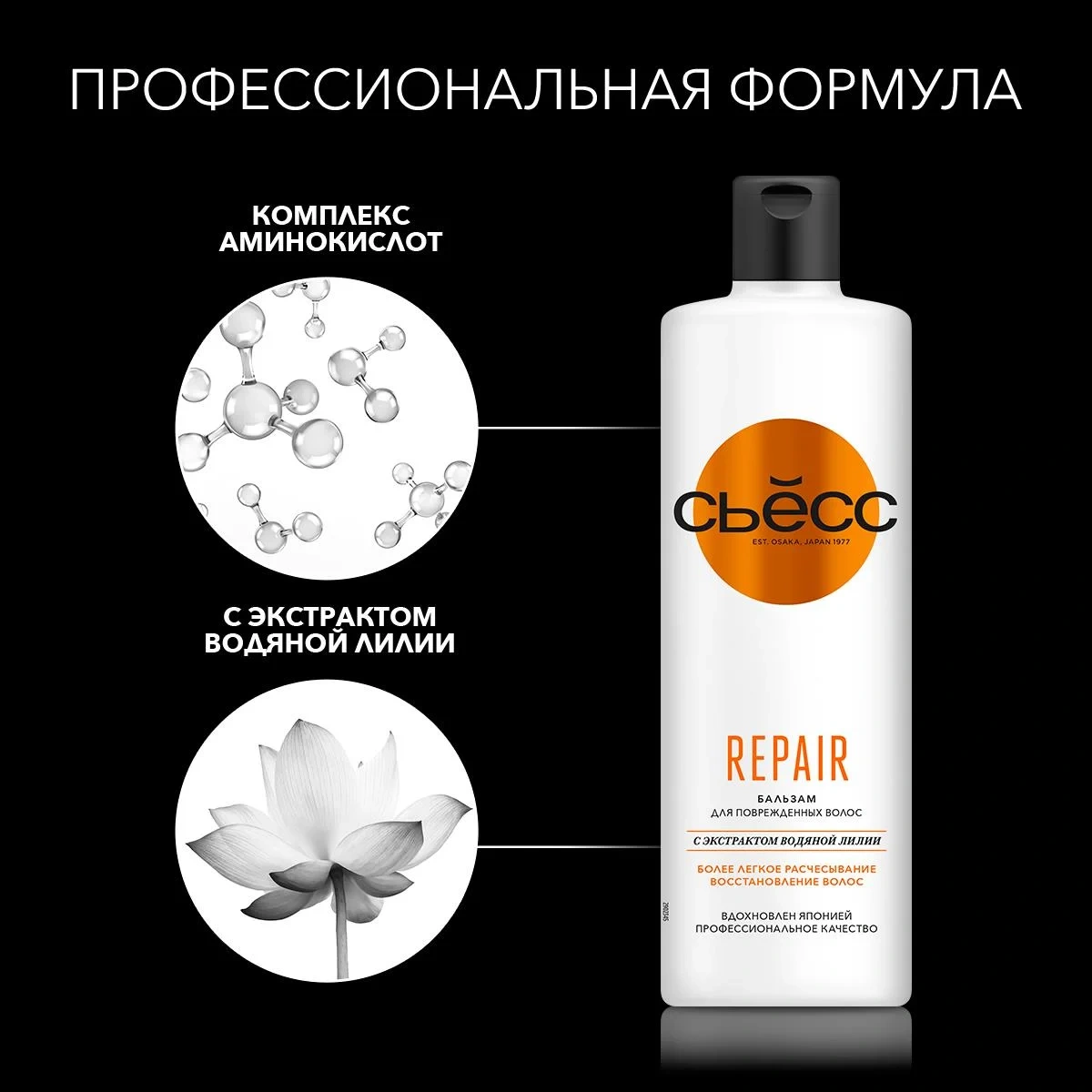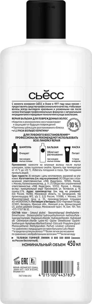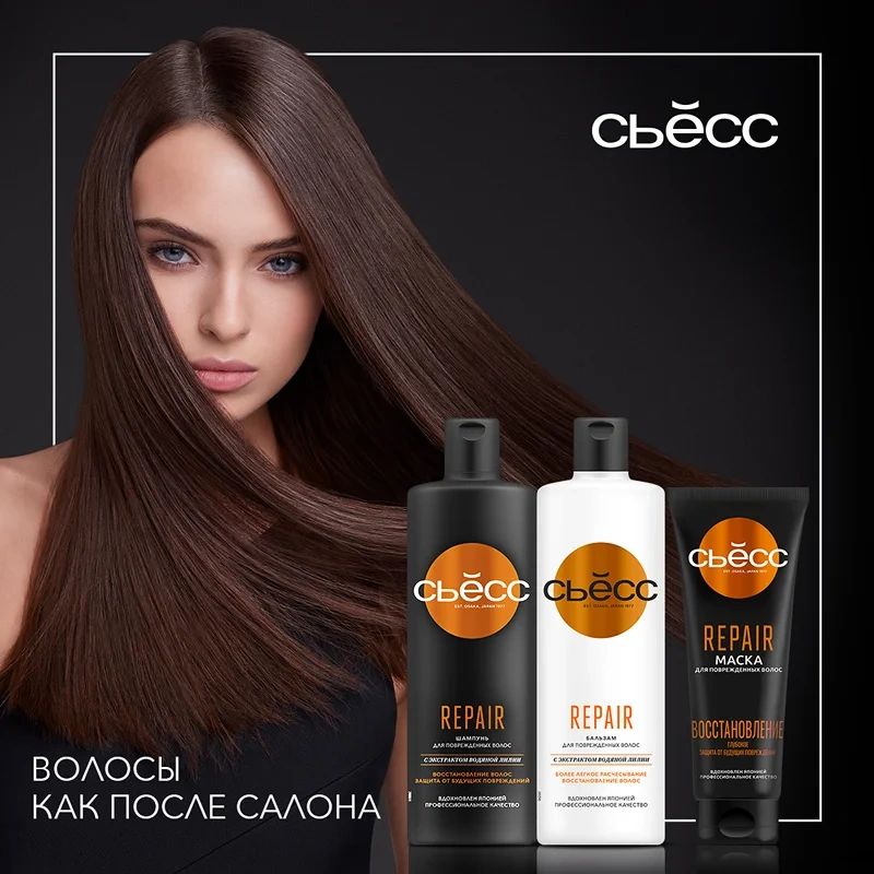 С момента основания Сьесс в Осаке в 1977 году наша миссия – предоставлять средства профессионального качества, чтобы ваши волосы всегда выглядели красивыми и ухоженными как после салона. Профессиональные формулы, вдохновленные Японией, соединяют в себе натуральные ингредиенты и передовые технологии в уходе за волосами. Сьесс женский бальзам Repair для поврежденных волос: облегчает расчесывание; восстанавливает волосы; предотвращает будущие повреждения.