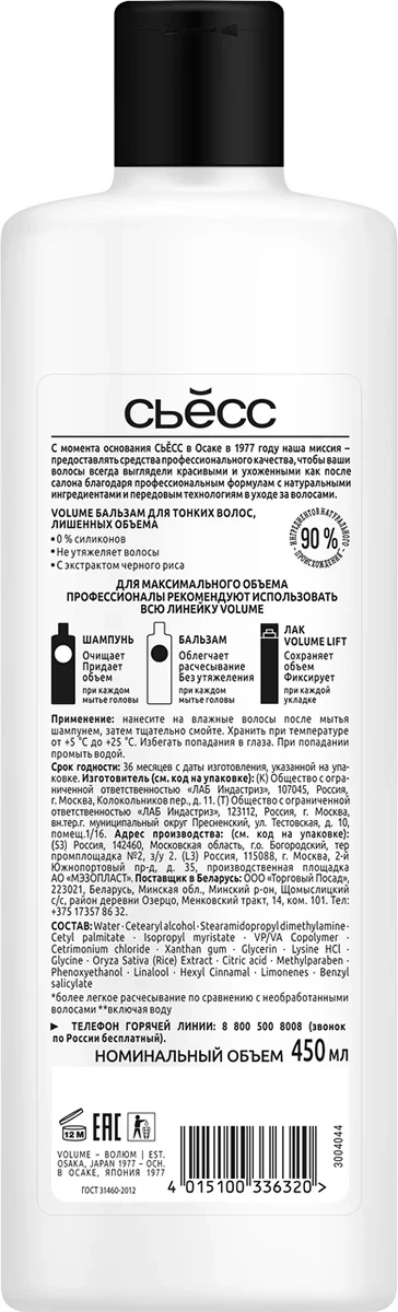 С момента основания Сьесс в Осаке в 1977 году наша миссия – предоставлять средства профессионального качества, чтобы ваши волосы всегда выглядели красивыми и ухоженными как после салона. Профессиональные формулы, вдохновленные Японией, соединяют в себе натуральные ингредиенты и передовые технологии в уходе за волосами. Сьесс женский бальзам Volume для тонких волос, лишенных объёма: облегчает расчесывание; 0% силиконов – не утяжеляет волосы; объем до 48 часов.