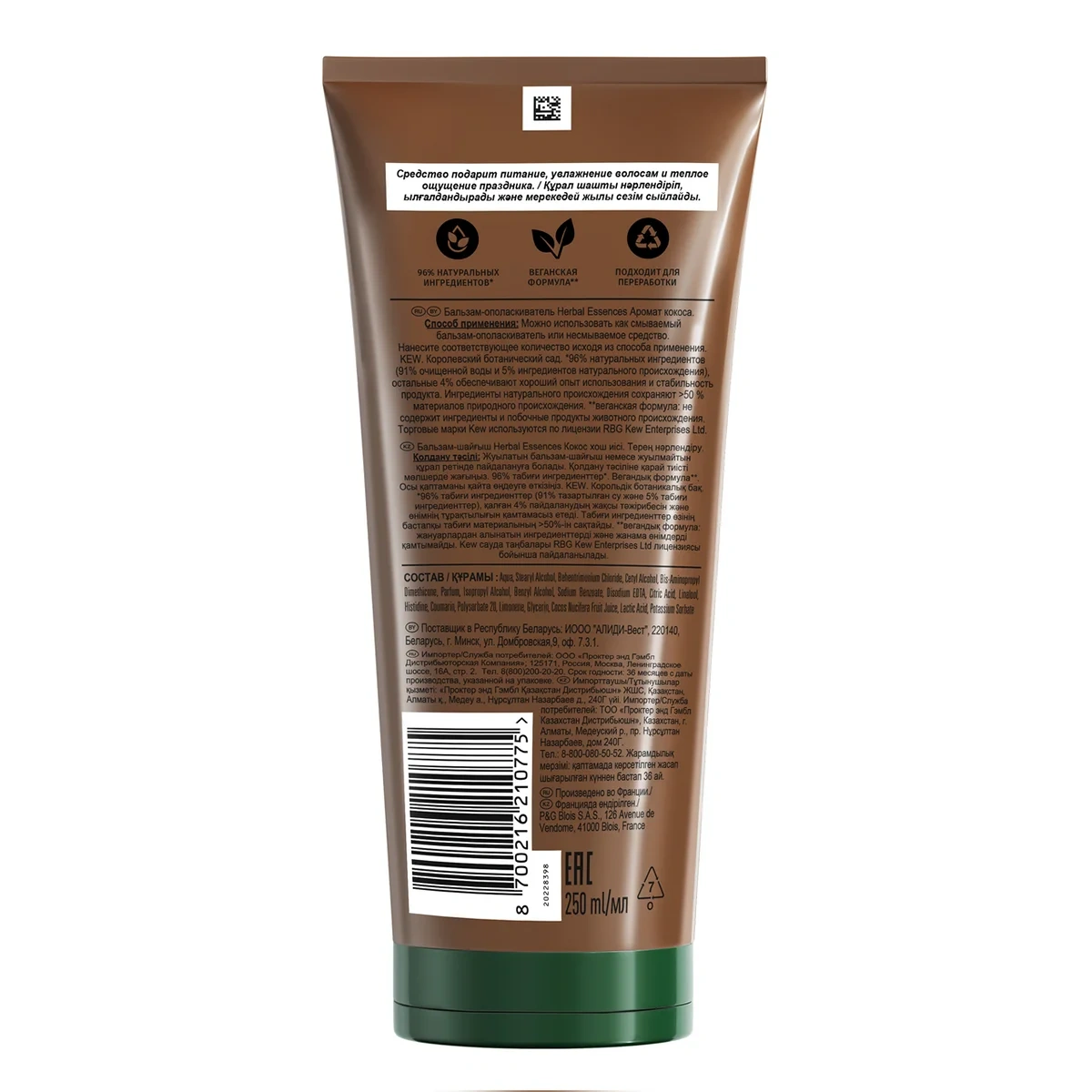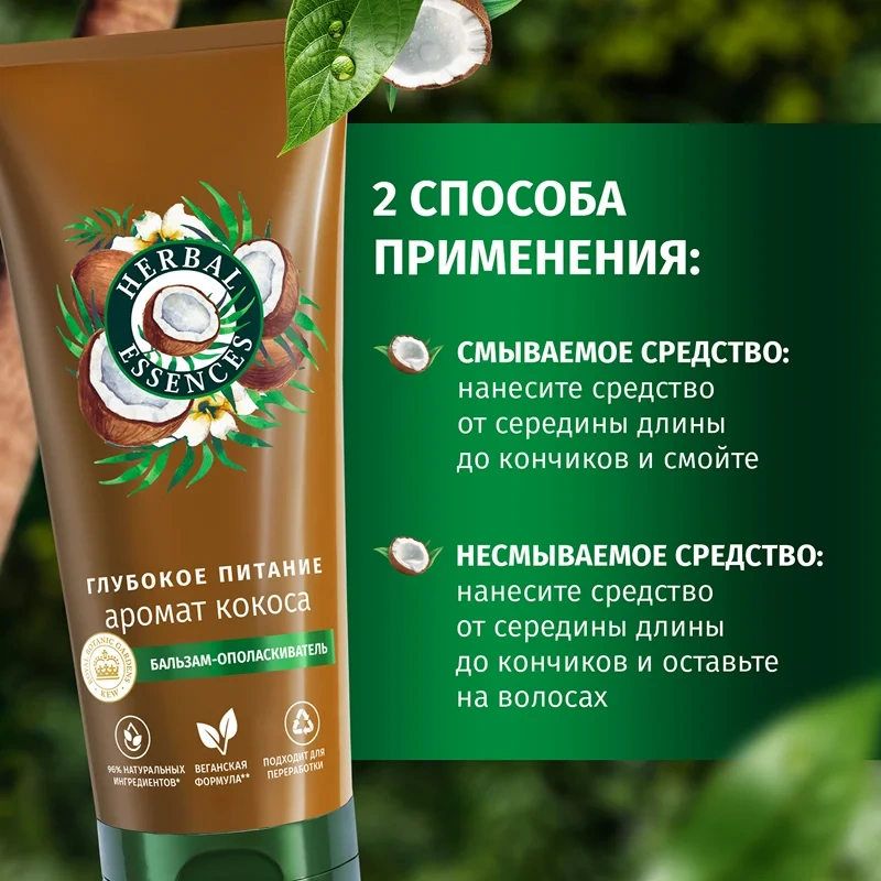 Подходит для сухих и поврежденных волос. Бальзам-ополаскиватель питает и укрепляет волосы, наполняя их чарующим ароматом кокоса. В результате волосы становятся более живыми, мягкими и блестящими. Бальзам-ополаскиватель на 96% состоит из натуральных ингредиентов (очищенная вода и натуральные ингредиенты, прошедшие ограниченную обработку). Его питательная формула обогащена натуральным сертифицированным кокосовым молоком и другими растительными экстрактами, качество которых одобрено Королевским Ботаническим Садом Кью в Лондоне. Не содержит продуктов животного происхождения. Herbal Essences аттестован международной организацией PETA как Cruelty-Free: вся продукция бренда не тестируется на животных. Для наилучшего эффекта используйте совместно с шампунем Питание и Сила и интенсивной маской и маслом для волос из коллекции Essences of Life.