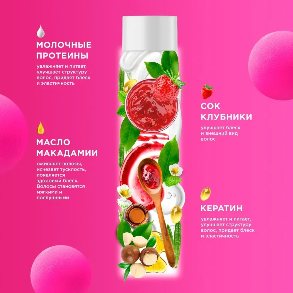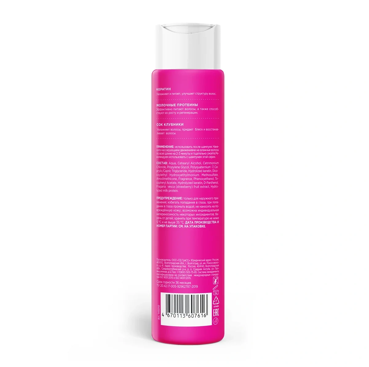 Подходит для секущихся и поврежденных волос. Бальзам с эффектом ламинирования, с соком клубники и молочными протеинами, кератином и керамидом — это эффективное средство по уходу за всеми типами волос, в том числе склонными к выпадению. Кондиционер придает мягкость и живой блеск, облегчает расчесывание, делая волосы эластичными, мягкими и увлажненными. Бальзам для волос женский интенсивно питает и придает здоровый блеск волосам, делая их гладкими и ухоженными. Содержащийся в составе Керамид — это блеск, защита от ломкости, защита и улучшение структуры волос. Молочные протеины эффективно питают волосы, а также способствуют их росту и регенерации. Сок клубники увлажняет волосы, придает блеск и восстанавливает волосы. Бальзам ополаскиватель легко смывается по всей длине, не утяжеляя структуру волос. Регулярное использование увлажняющего бальзама для волос защищает волосы от негативного воздействия внешней среды, средств для укладки и фена, облегчает расчесывание. Профессиональный бальзам для волос подходит для всех типов волос, бальзам для окрашенных волос и для натуральных волос. Бальзам для волос профессиональный подходит для ежедневного применения, для салонного и для домашнего ухода.