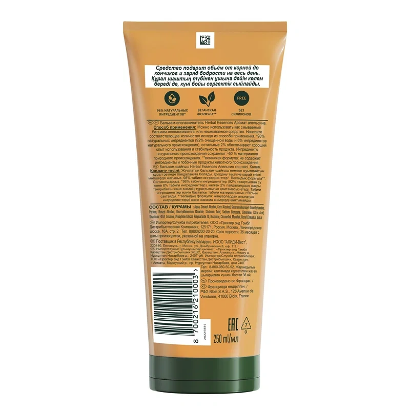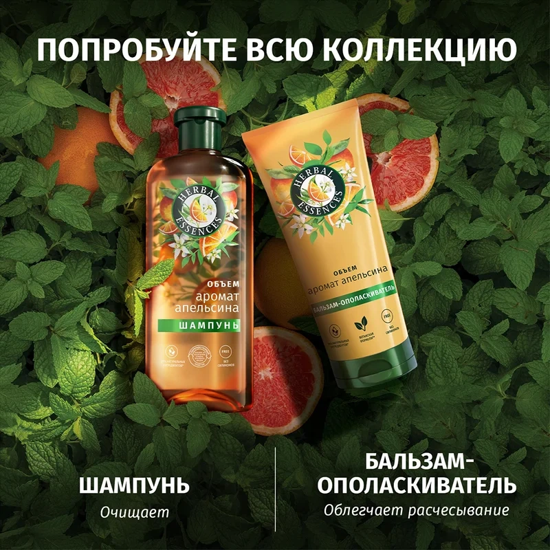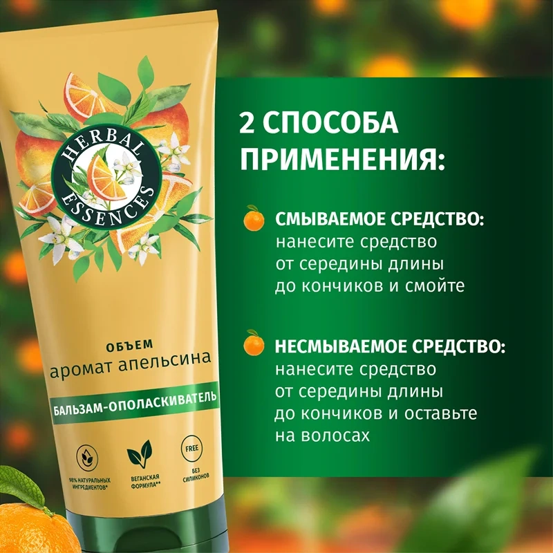 Насладитесь лучами солцна и зарядом энергии вместе с Herbal Essences. Бальзам-ополаскиватель Herbal Essences Аромат апельсина Объём возвращает жизнь тонким волосам и наполняет их бодрящим цитрусовым ароматом. Cмесь растительных питательных нутриентов, насыщенная апельсином и эликсиром лимона из Италии, подарит легкое расчесывание и объем от корней до кончиков волосам. Уникальная технология бальзама-ополаскивателя позволяет использовать средство 2 способами: смываемое (нанесите от середины длины до кончиков, затем смойте) и несмываемое (нанесите от середины длины до кончиков и оставьте на волосах). Мы тщательно отбираем ингредиенты природного происхождения, чтобы привнести силу растений в вашу ванную комнату. Восстановите природную красоту волос и превратите уход за волосами в момент наслаждения вместе с коллекцией Аромат Апельсина Объём. Веганская формула.