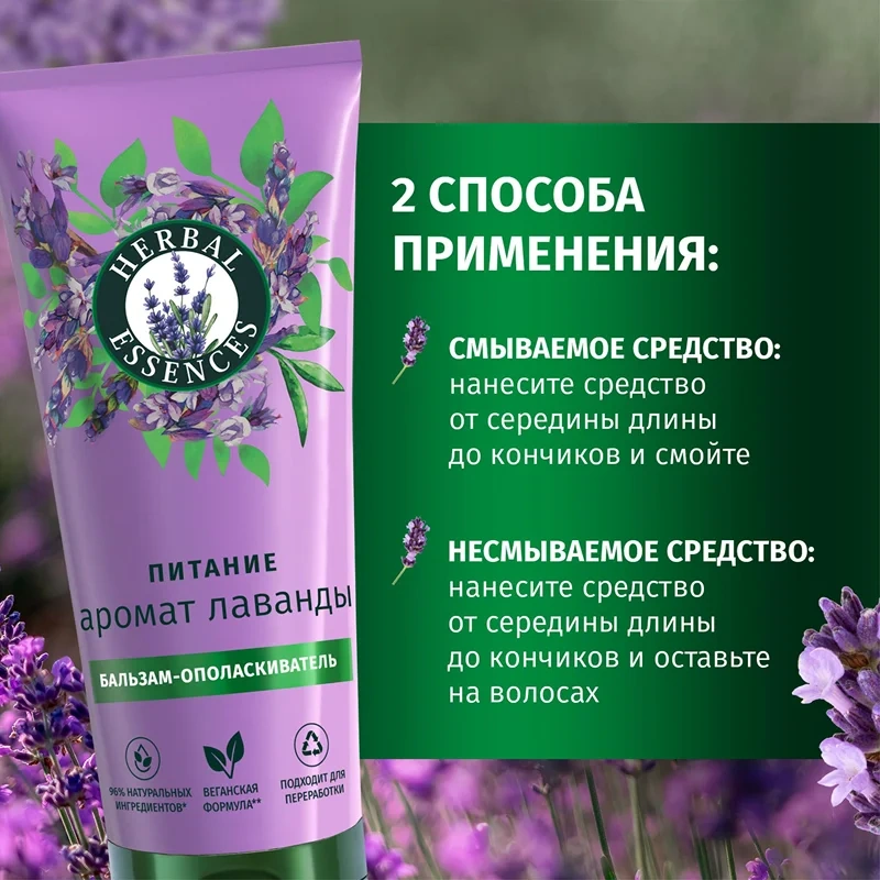 Забудь о заботах с умиротворяющим ароматом лаванды. Бальзам-ополаскиватель Herbal Essences Аромат лаванды Питание делает гладкими пушистые и непослушные волосы, а насыщенный цветочный аромат лаванды подарит эффект расслабления. Cмесь растительных питательных нутриентов, наполненная эликсиром лаванды из Прованса (юг Франции), подарит питание и легкое расчесывание волосам. Уникальная технология бальзама-ополаскивателя позволяет использовать средство 2 способами: смываемое (нанесите от середины длины до кончиков, затем смойте) и несмываемое (нанесите от середины длины до кончиков и оставьте на волосах). Мы тщательно отбираем ингредиенты природного происхождения, чтобы привнести силу растений в вашу ванную комнату. Восстановите природную красоту волос и превратите уход за волосами в момент наслаждения вместе с коллекцией Аромат Лаванды Питание. Веганская формула.
