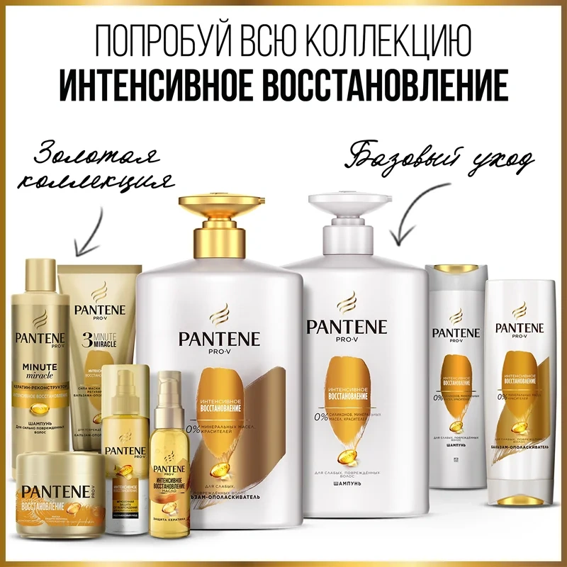 Теперь в большом объеме с удобным дозатором! Бальзам-ополаскиватель Pantene Pro-V (Пантин Про-Ви) Интенсивное Восстановление идеально подходит для ослабленных, поврежденных волос. Благодаря комплексу Pro-V он насыщает волосы питательными веществами и восстанавливает волосы по всей длине, не утяжеляя их. Бальзам-ополаскиватель мгновенно устраняет ломкость и признаки повреждений, предотвращает появление секущихся кончиков и дарит волосам гладкость и здоровый блеск. Подходит для окрашенных волос. Для достижения максимального эффекта используйте в сочетании с шампунем, также доступном в большом размере, и маской; дополните уход маслом и спреем для волос из серии Интенсивное Восстановление. Легендарный бренд Pantene Pro-V заботится о здоровье и красоте волос женщин по всему миру уже более 75 лет. Сегодня Pantene — это богатый научный опыт ведущих экспертов и самые эффективные ингредиенты и питательные вещества, протестированные и одобренные Швейцарским Институтом Витаминов.