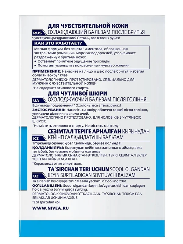Новая мягкая формула без спирта и ментола, обогащенная экстрактами ромашки и морских водорослей, мгновенно успокаивает раздраженную бритьем кожу, одновременно обеспечивая охлаждающий эффект. Бальзам после бритья Охлаждающий от NIVEA MEN без спирта и ментола в составе разработан специально для чувствительной мужской кожи склонной к раздражению и шелушению. Освежает и успокаивает кожу, имеет приятный мужской аромат. Быстро впитывается без ощущения жирной пленки на лице, не оставляет жирного блеска.