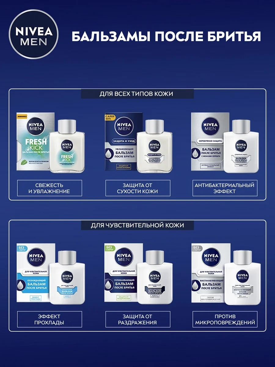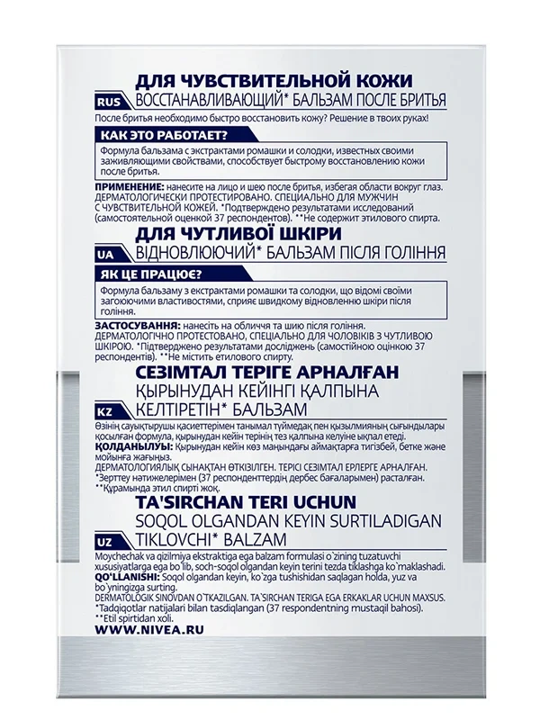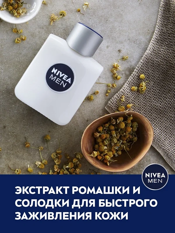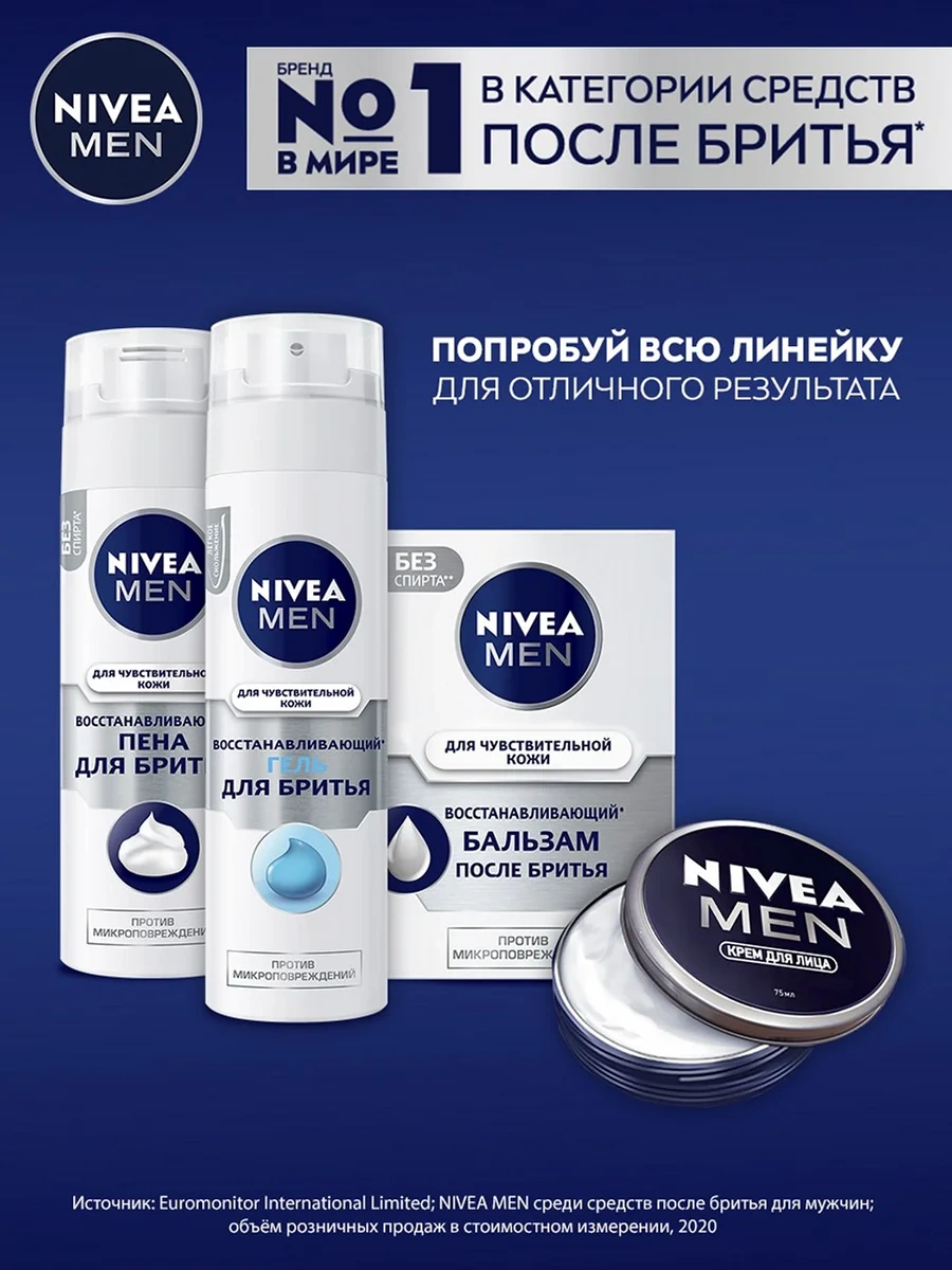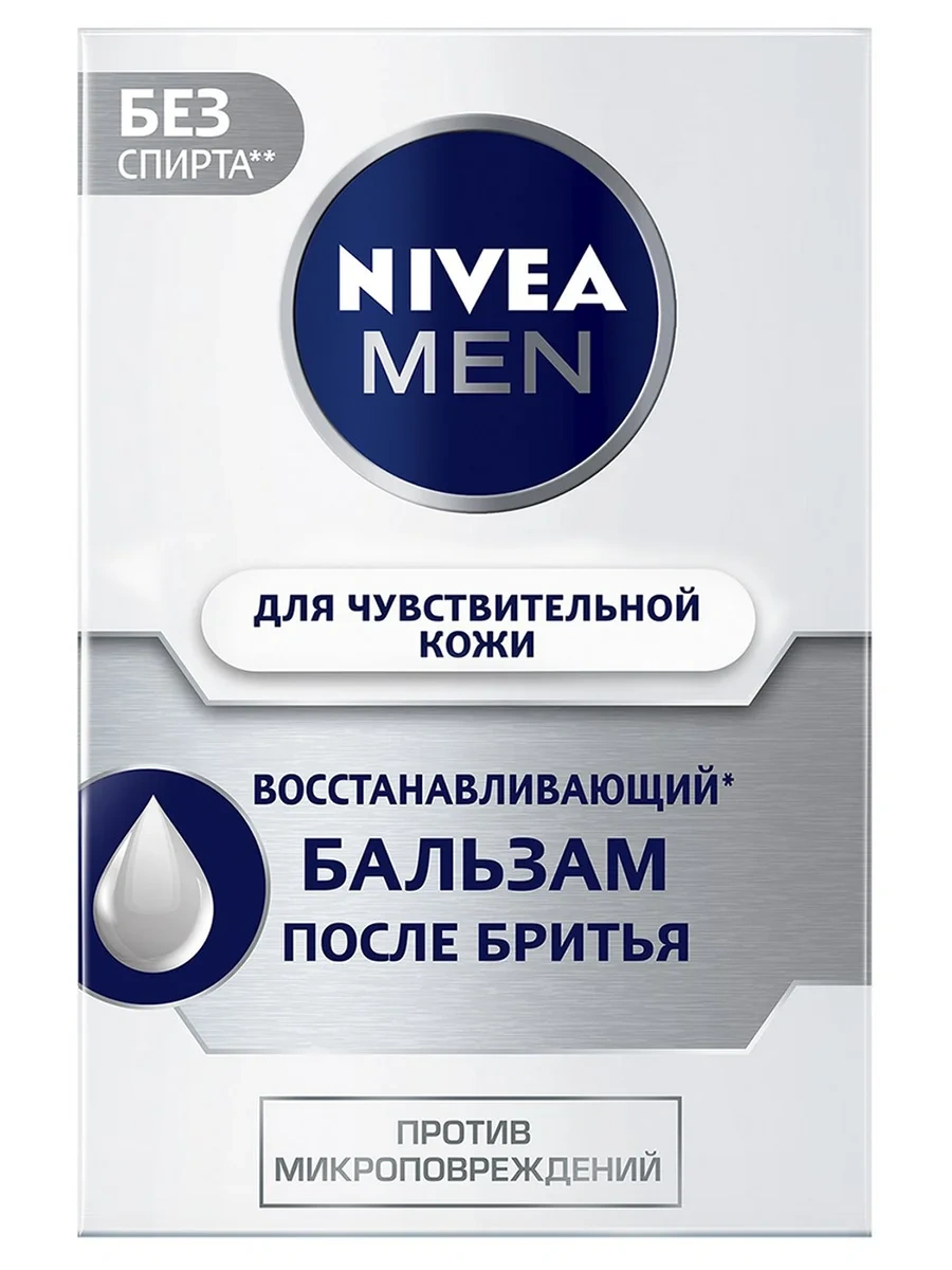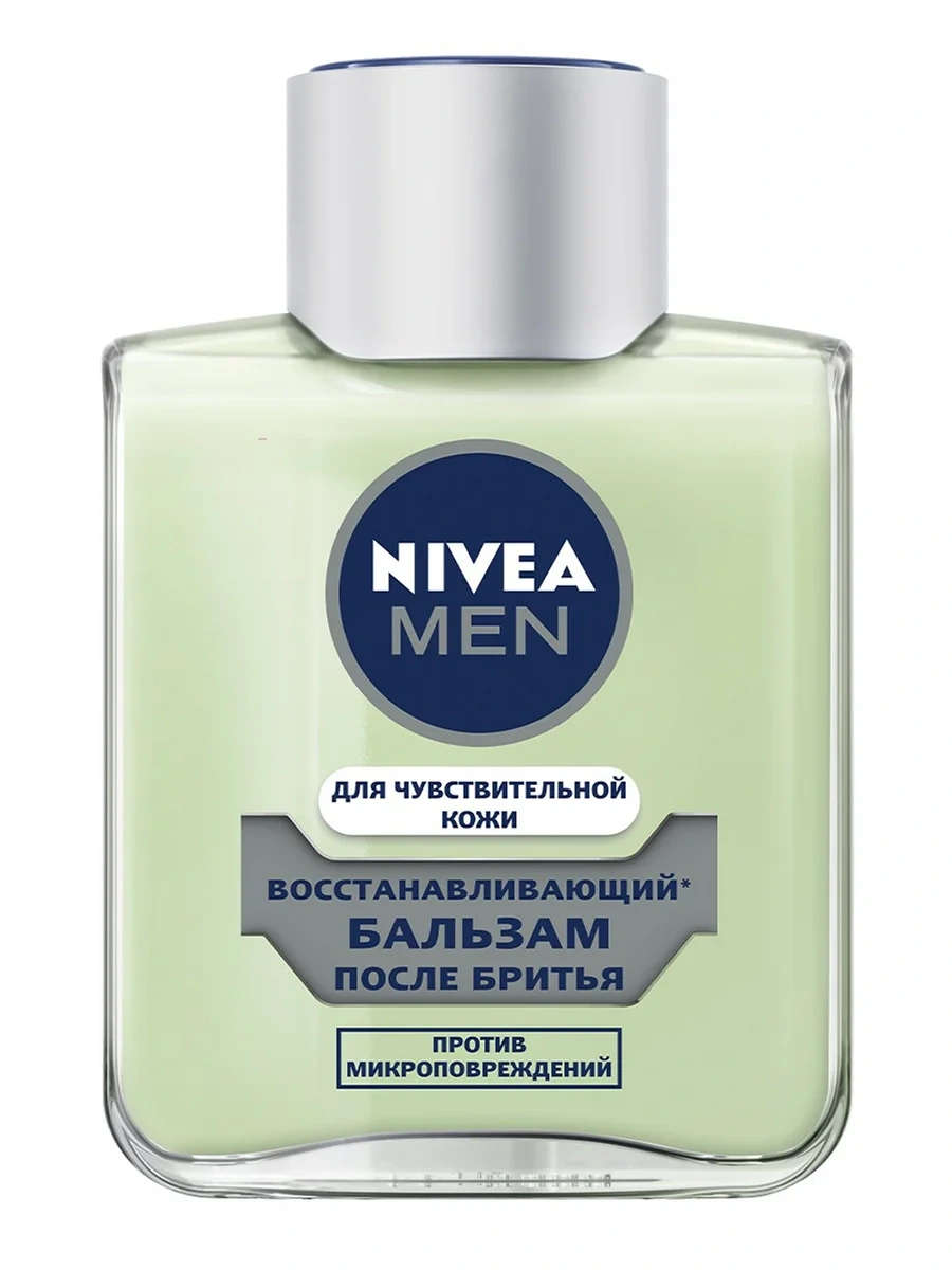 Nivea представляет линию средств для и после бритья, разработанной специально для чувствительной кожи. Восстанавливающий бальзам после бритья от Nivea, обогащенный экстрактами ромашки и солодки, известными своими заживляющими свойствами, способствует быстрому восстановлению кожи после бритья. Бальзам не содержит спирта и поэтому идеально подходит для чувствительной кожи. Бальзам быстро впитывается без ощущения жирной пленки на лице, не оставляет жирного блеска.