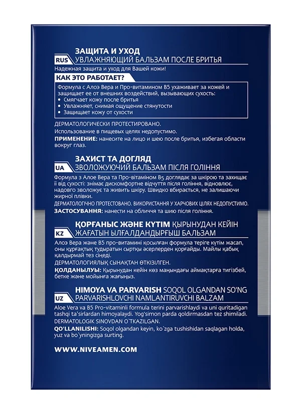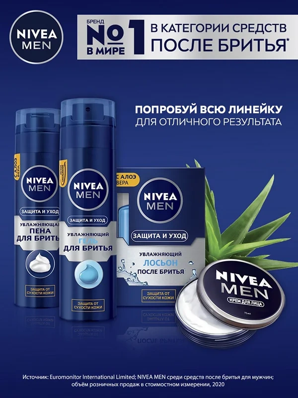 Легкая формула с увлажняющими компонентами, Витамином Е и Алоэ Вера. Линия увлажняющих средств от Nivea создана специально для мужчин, чья кожа склонна к сухости и стянутости после бритья. Легкая формула мгновенно снимает дискомфортные ощущения, надолго увлажняет и питает кожу.