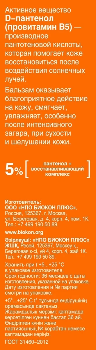 Бальзам смягчает, увлажняет, уменьшает чувство стянутости и дискомфорта. Благодаря содержанию Д-пантенола бальзам способствует восстановлению кожных покровов после интенсивного воздействия солнечных лучей. Экстракт ромашки прекрасно успокаивает, интенсивно увлажняет, питает и смягчает чувствительную и поврежденную кожу.