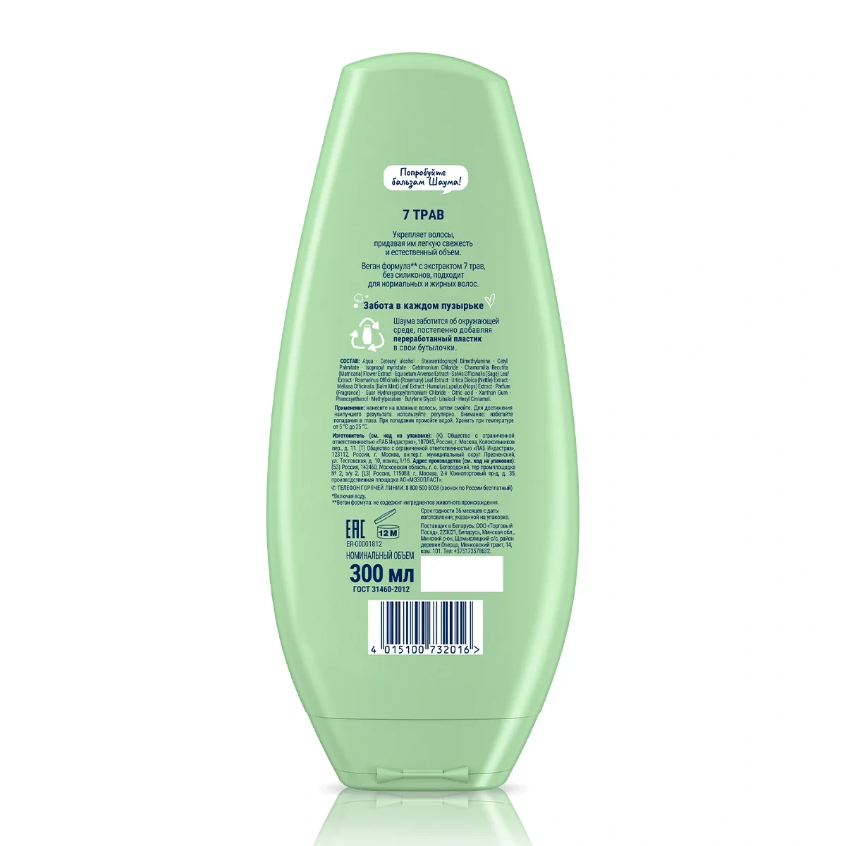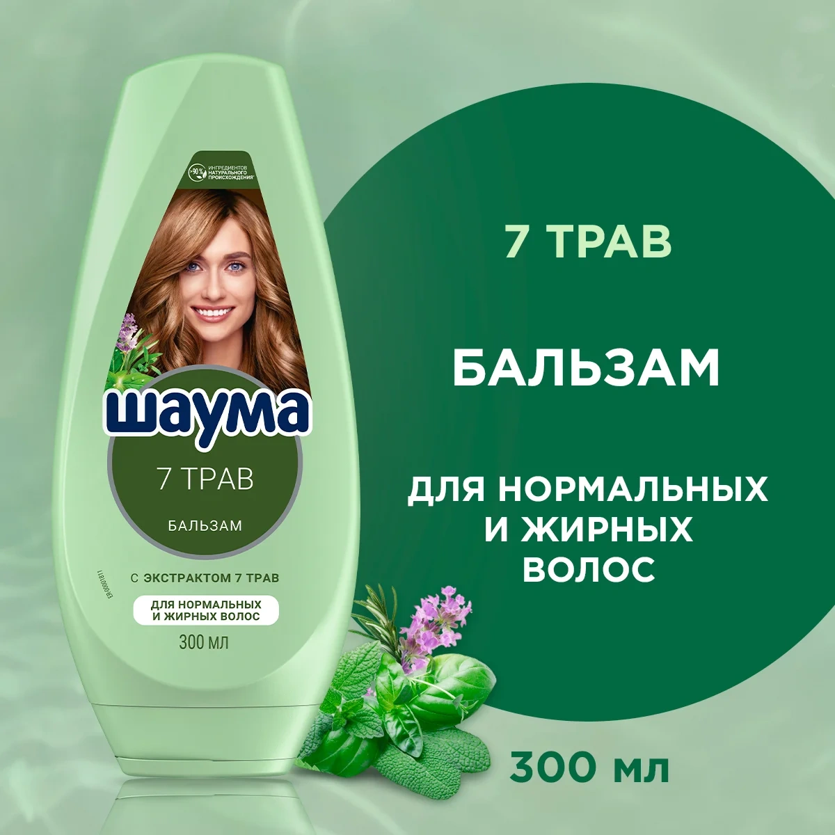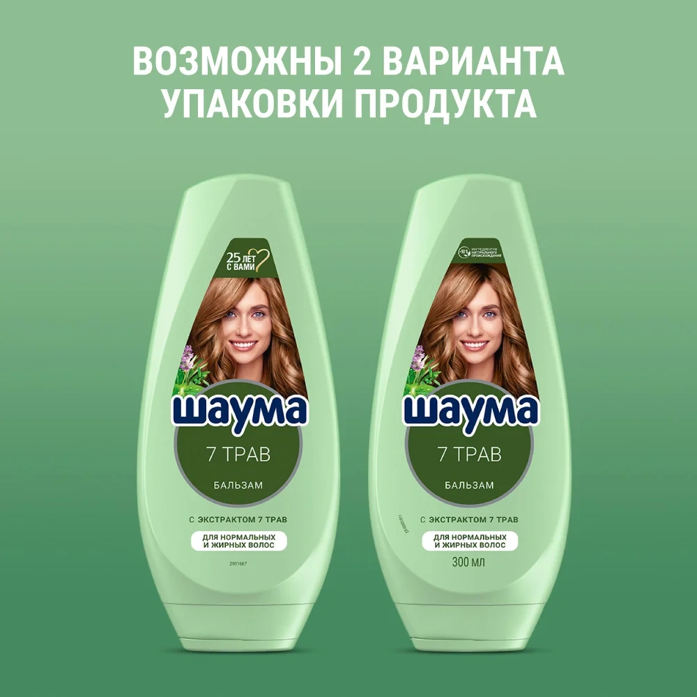 Шаума 300 мл Бальзам 7 Трав для нормальных и жирных волос: укрепляет волосы; придает волосам свежесть и естественный объем; с экстрактом 7 трав: розмарин, ромашка, хмель, хвощ, шалфей, крапива, мелисса; >90% ингредиентов натурального происхождения*; веган формула** без силиконов; подходит для нормальных и жирных волос. *Включая воду. **Не содержит ингредиентов животного происхождения.