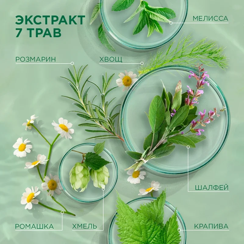 | Масла и экстракты | экстракт крапивы; экстракт розмарина; экстракт ромашки; экстракт хмеля; экстракт шалфея |