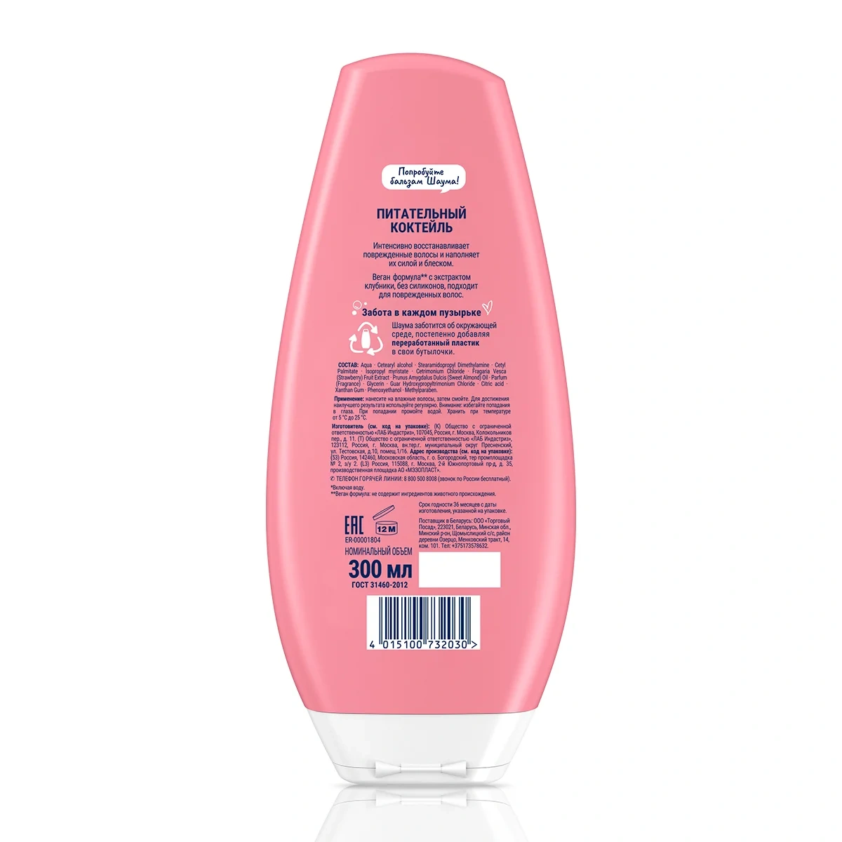 Шаума 300 мл Бальзам Питательный Коктейль для поврежденных волос: интенсивно восстанавливает поврежденные волосы; наполняет их силой и блеском; с экстрактом клубники; >90% ингредиентов натурального происхождения*; веган формула** без силиконов; подходит для поврежденных волос. *Включая воду. **Не содержит ингредиентов животного происхождения.