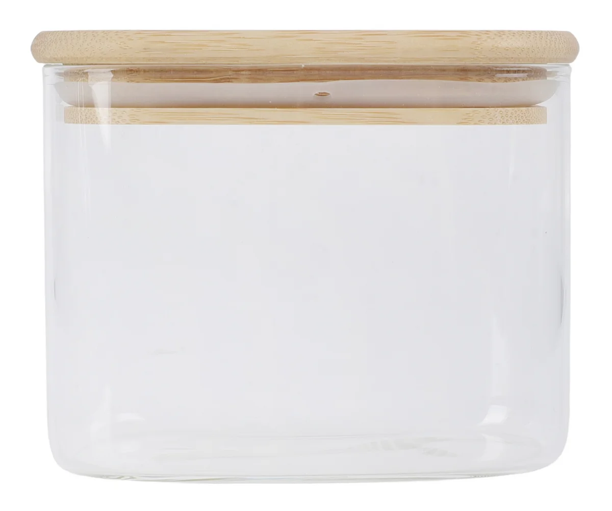 Квадратная стеклянная банка с бамбуковой крышкой (размеры 12 x 8 x 10 см, объем 0,53 л). Вес изделия составляет 250 г. Предназначена для бытового использования.