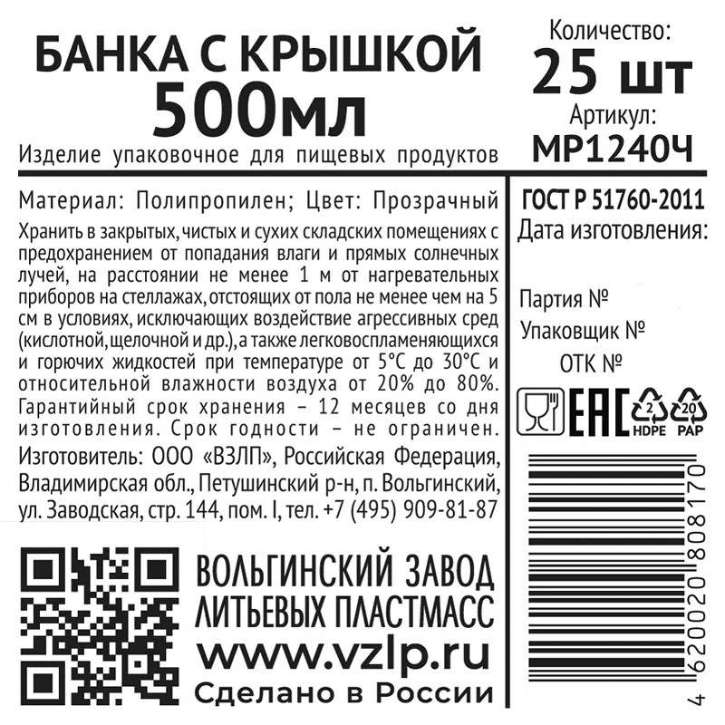 Банка Vzlp с крышкой пластиковая прозрачная 500мл, 25шт