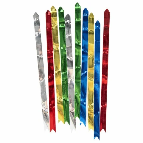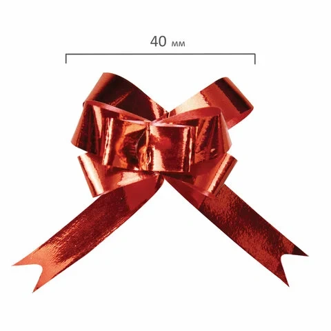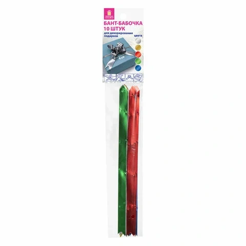 Набор состоит из 10-ти бантов-бабочек в пяти цветах с эффектом металлик - серебристый, золотистый, красный, зеленый, синий. Ширина ленты - 1,2 см, длина ленты в разобранном виде - 22 см. Банты выполнены из прочного полипропилена (70%), полиэтилена (15%) и полиэтилентерефталата (15%). Диаметр банта в собранном виде около 4 см.