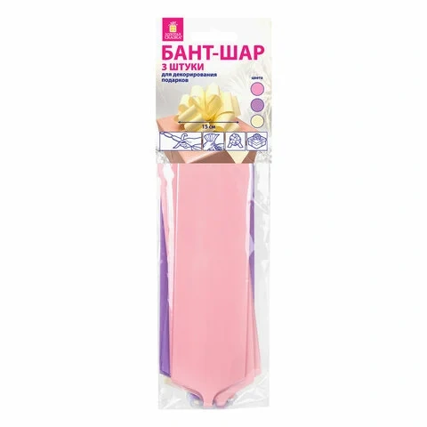 Набор состоит из 3-х бантов-шаров в трех цветах с глянцевым эффектом - розовый, нежно-фиолетовый и бежевый. Ширина ленты - 5 см, длина ленты в разобранном виде - 157 см. Банты выполнены из прочного полипропилена (70%), полиэтилена (15%) и полиэтилентерефталата (15%). Диаметр банта в собранном виде около 15 см.