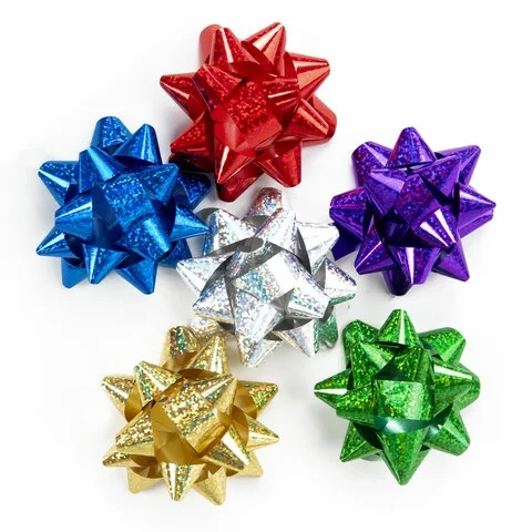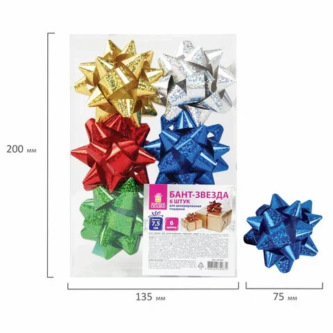 Бант-звезда d = 7,5 см для подарка, НАБОР 6 шт., голографические цвета ассорти, ЗОЛОТАЯ СКАЗКА, 5918