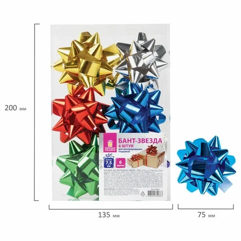 Набор состоит из 6-ти бантов-звезд в шести цветах с эффектом металлик - серебристый, золотистый, красный, синий, зеленый, фиолетовый. Банты выполнены из прочного полипропилена (70%), полиэтилена (15%) и полиэтилентерефталата (15%). Диаметр банта - 7,5 см.