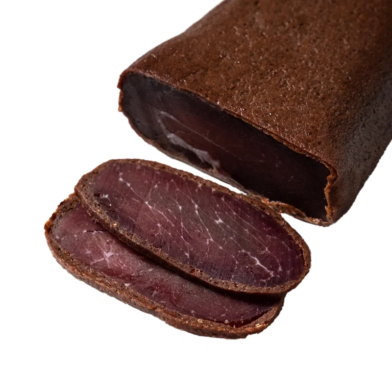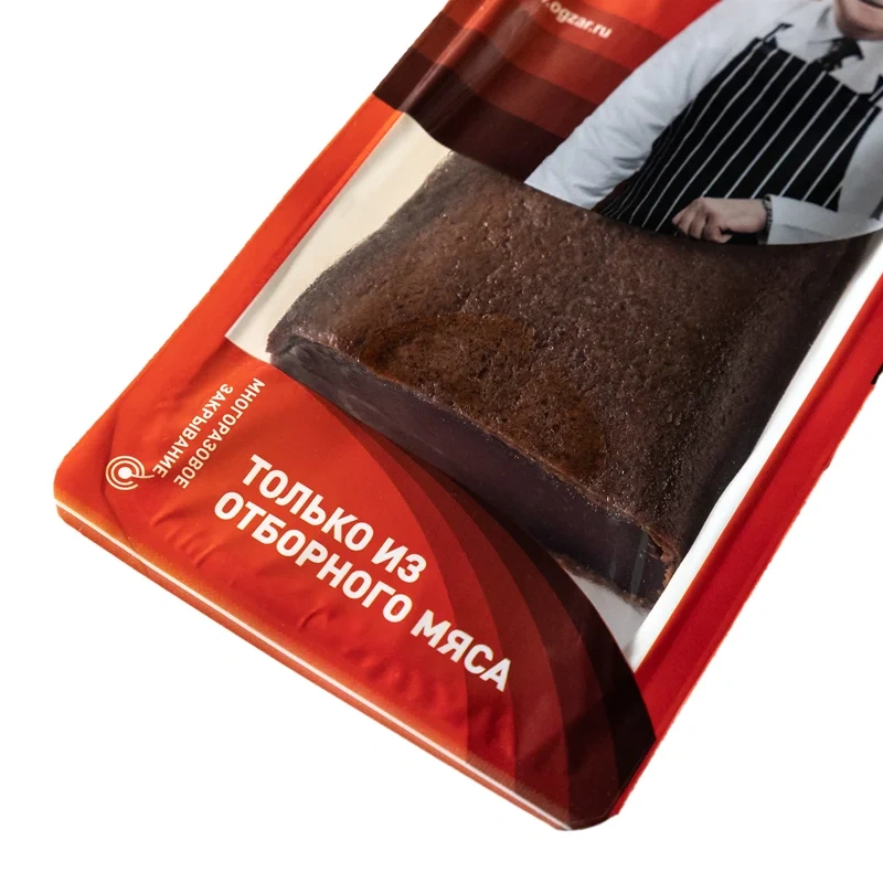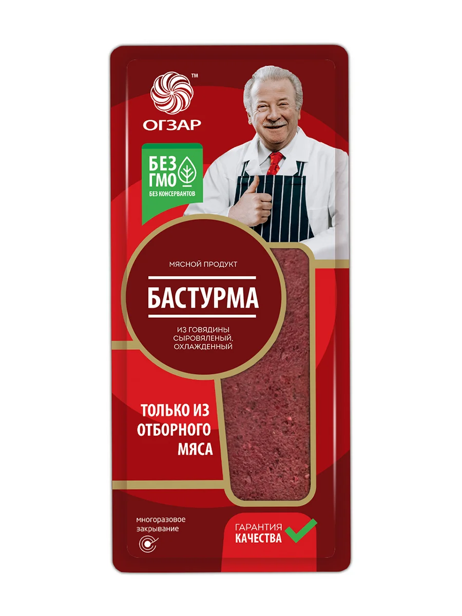 Бастурма Огзар сыровяленая, 250 г приготовлена по традиционному рецепту из отборного мяса. Этот деликатес является неотъемлемой часть национальной кухни народов, населяющих Закавказье и территории Ближнего Востока. Он производится вручную из говядины высшего сорта и специй. Неповторимые вкусовые нюансы придают классическая технология, позаимствованная из советских времен, и натуральные добавки — семена пажитника, красный перец, чеснок и паприка. Мясо имеет очень плотную текстуру и темно-красный, скорее даже бордовый цвет. Оно очень ароматное, с насыщенным традиционным вкусом, в котором ощущаются пряные и островатые ноты. Продукт поставляется в формате готовой нарезки, которая находится в упаковке флоу-пак. Все кусочки имеют одинаковый размер и форму. Все, что требуется, это разложить бастурму на тарелке и украсить зеленью. Можно дополнить закуску ломтиками сладкого перца, огурцов и помидоров — получится ярко и очень аппетитно.