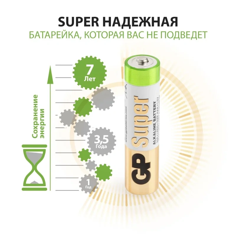 — Алкалиновые батарейки GP серии Super Alkaline — элементы питания популярного ’мизинчикового’ формата. Они работают на улучшенной марганцево-цинковой системе и щелочном электролите. Благодаря долгому удержанию заряда они отлично подходят для любых ’долгоиграющих’ приборов, работающих дома или на даче: фонариков, будильников, часов, детских игрушек, компьютерных мышек и клавиатур, пультов дистанционного управления и т. д.