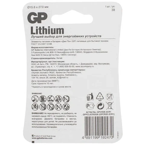 Батарейка GP Lithium CR2E, литиевая, 1 шт., блистер, 3В, CR2E-2CR1