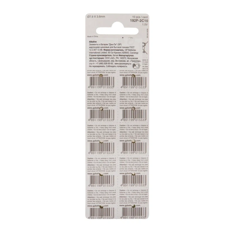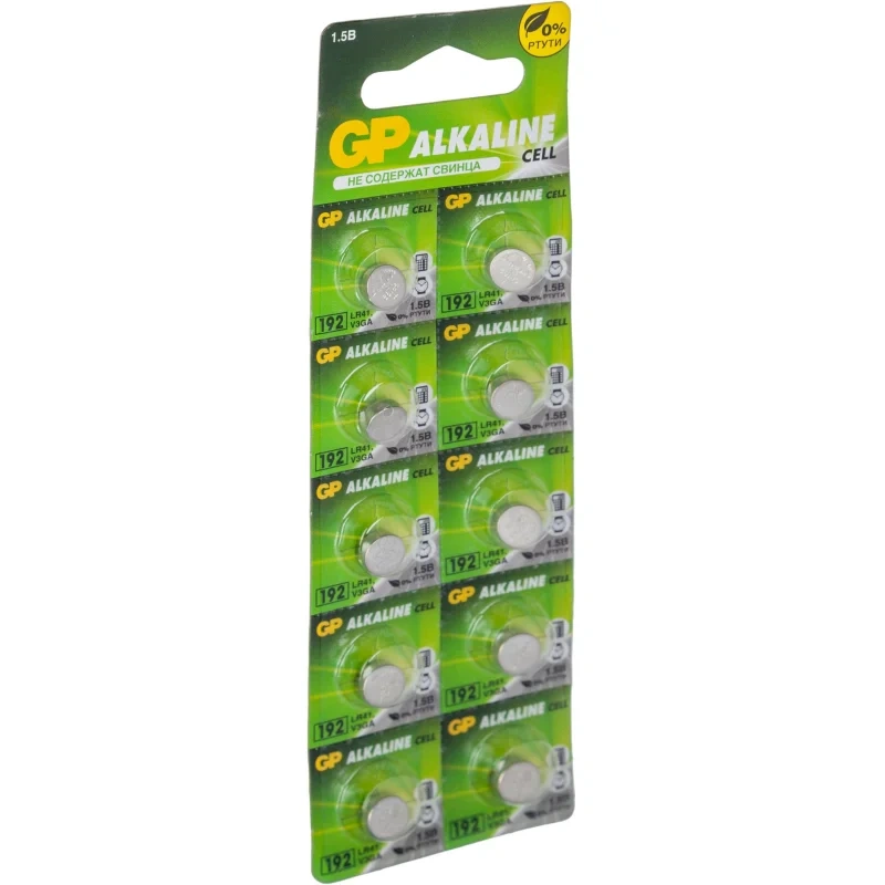 Батарейки GP 192-BC10 LR41— Компания GP предлагает комплект из 10 марганцево-цинковых дисковых батареек, применяемых для калькуляторов, часов, лазерных указок, секундомеров, кухонных весов, детских игрушек. Купив одну такую упаковку, вы сможете обеспечить энергией сразу несколько нужных вам приборов.— Начальное напряжение (1,5 В) и номинальная емкость марганцево-цинковых батареек ниже, чем у серебряно-цинковых, зато они имеют более низкую себестоимость.— Также батарейки GP отличаются низким внутренним сопротивлением, стабильным разрядом, благодаря которому долго сохраняют рабочее состояние, и повышенным сроком хранения — 3 года.— Элементы питания GP устойчивы к вибрации и имеют отличные противоударные свойства, что гарантирует вашим приборам стабильную работу и безопасность.— Алкалиновые батарейки GP изготавливаются по самым передовым технологиям, без использования ртути, кадмия, свинца. В результате они абсолютно безопасны для людей и окружающей среды.— Чтобы дисковые батарейки работали исправно, при их установке обязательно нужно соблюдать полярность.— Алкалиновые батарейки GP не предназначены для перезарядки, их нельзя ставить в зарядные устройства.— Категорически запрещается бить алкалиновые батарейки, разбирать их, нагревать, держать у открытого огня, брать в рот и проглатывать. Все это несет большую опасность для здоровья.— По завершении использования элементов питания не выбрасывайте их с остальным мусором, а приносите в специальные контейнеры для последующей переработки. Такие контейнеры сейчас есть во многих торговых центрах и крупных магазинах бытовой техники.