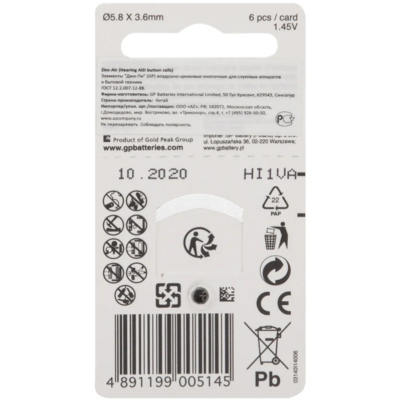 Батарейка Gp ZA10F, воздушно-цинковая, 6шт/уп