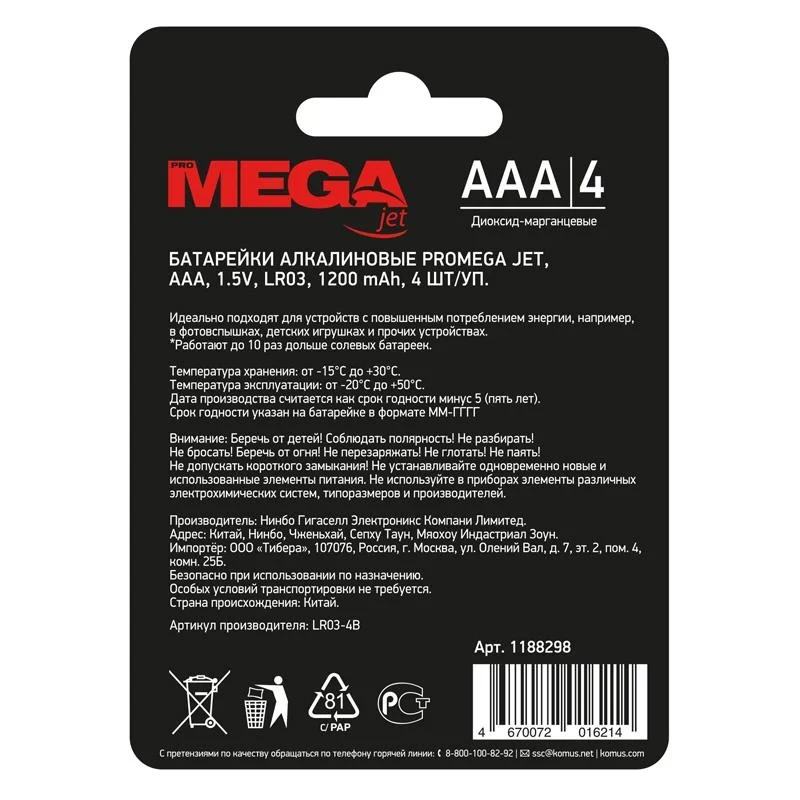 Батарейка ААА мизинчиковая Комус (ProMega) (4 штуки в упаковке)
