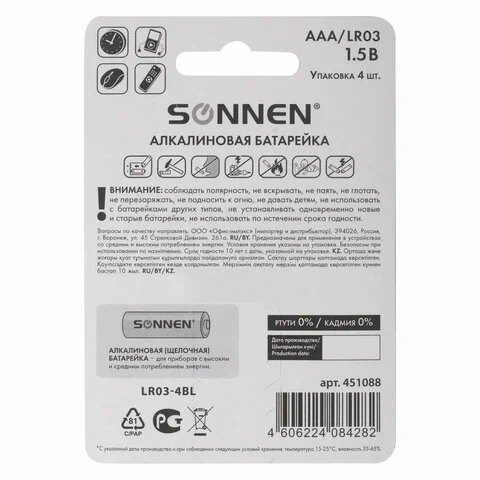 Батарейка Sonnen ААА LR03, 1.5В, алкалиновая, 4шт/уп