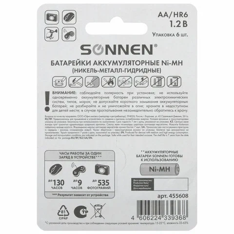 В упаковке шесть аккумуляторов, которые относятся к типоразмеру AA. Комплект никель-металлогидридных аккумуляторов SONNEN – идеальное решение для энергоемких и часто используемых устройств. Они отлично подойдут для детских игрушек, фотокамер, оборудования для видео- и фотосъемки и т.д.