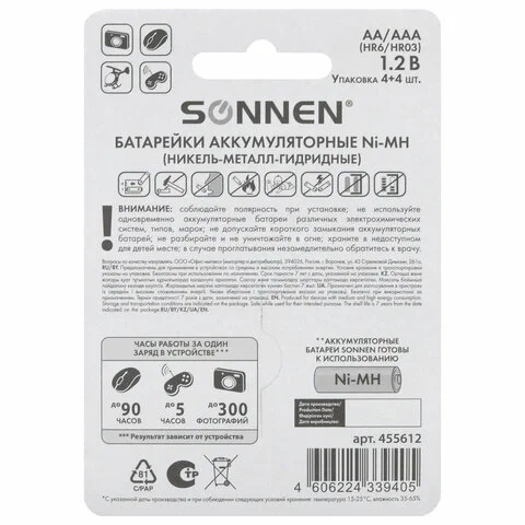 Аккумуляторы SONNEN AA 2700 мА·ч и AAA 1000 мА·ч относятся к никель-металлогидридным аккумуляторам. Они могут многократно перезаряжаться и выдерживают около 1000 циклов перезарядки. Аккумуляторы прослужат в течение длительного времени.