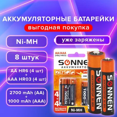 Батарейки аккумуляторные Ni-Mh пальчиковые / мизинчиковые НАБОР 8 шт. (AA+ААА) 2700/1000 mAh, SONNEN