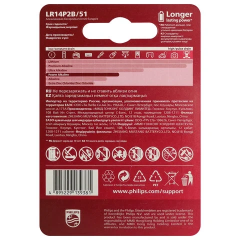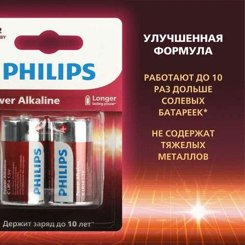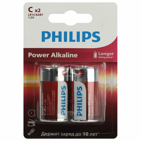 Батарейки алкалиновые КОМПЛЕКТ 2 шт., PHILIPS Power Alkaline, C (LR14, 14А), блистер, Б0062687